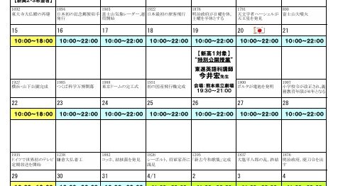 ①開館予定 3月は休館日がございません。 また、開館時間が3/9(日)からは