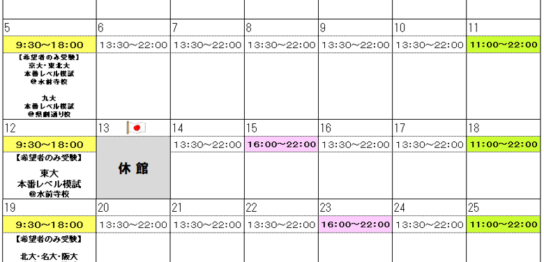 ①休館日 9/15(月) 大変申し訳ございません ②模試 名古屋・大阪大学本番レ