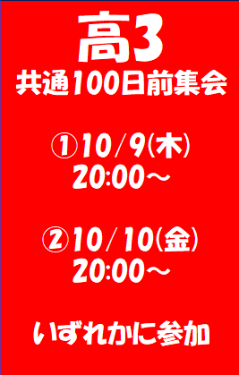 東進衛星予備校 熊本水前寺校 共通100日前集会実施 2025年10月5日 東進衛星予備校 熊本水前寺校 蓑田 朋和 早いもので共通テスト本番まで残り100日をきろうとしています。 「共通テスト100日をきったらあっという間」とはよく言ったものです。 水前寺校では共通100日前集会を実施します。 もちろん受験生にむけてです。 「いかにこの100日間でやりきれるか」にかかってきます。 来年の共通テスト本番は1/17(土)18(日)です。 まだまだやれることはたくさんありますので、どんどん来校して頑張っていきましょう。 蓑田 朋和 0